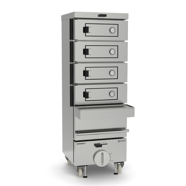 Гриль-печь угольная Estro Pro 4 — высокопроизводительная модель, ориентированная на предприятия питания/торговли, где требуется беспрерывное приготовление разнообразных блюд-гриль. Печь выполнена с 4-мя раздельными чугунными камерами, в каждой выдвигаемая нержавеющая решётка. Продуманная компактная конструкция позволяет значимо экономить место на профессиональной кухне. Непрерывный цикл работы обеспечивает возможность добавления топлива в процессе приготовления. Оптимальный микроклимат в помещении — благодаря чугунным перегородкам в камере, дым и жар не выходят из печи. Мощная, продуманная вытяжная система. Мобильность печи обеспечивают колёсные опоры.