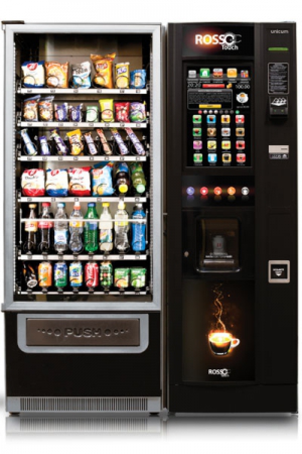 Комбинированный торговый автомат Unicum RossoBar Touch позволяет продавать 16 кофейных напитков, чай, ванильный капучино, а также широкий ассортимент продуктов питания и баночных/бутылочных напитков. Принимает оплату, выдаёт сдачу. И всё это один автомат, который не занимает много площади.Состоит он из кофейного и снекового модулей, корпус которых выполнен из стали с антивандальным покрытием. Настройки и контроль работы через USB-порт. Применены передовые системы защиты от краж, порчи.