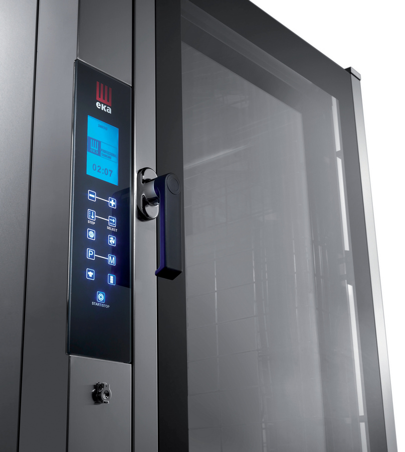 - сенсорная панель: LCD-дисплей, меню настроек (с выбором языка), программирование, работа с параметрами (шаг настроек, больше/меньше), управление скоростью вентиляторов, доступ к каталогу рецептов, включение предварительного разогрева, Start/Stop;