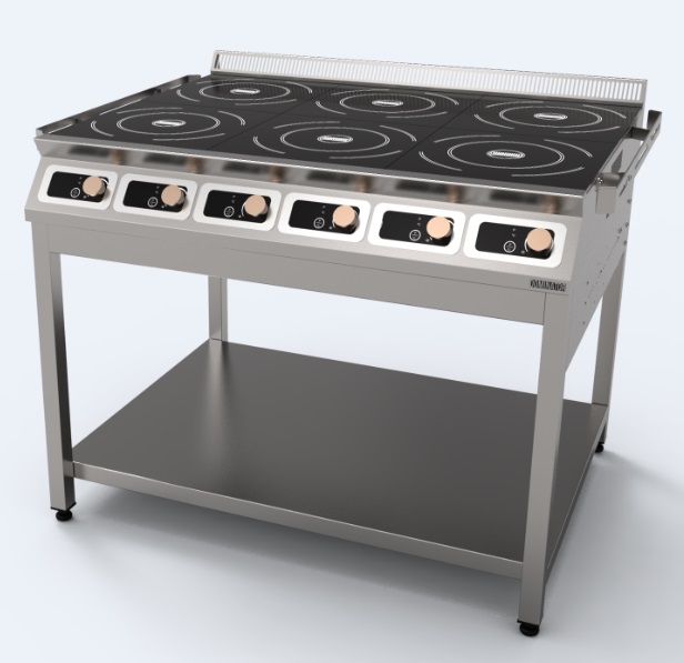Плита индукционная Dominator ПЭИ-6 D — шестиконфорочная модель, оснащённая сенсорной панелью управления. Установлена на открытом стенде-подставке с полкой и регулируемыми по высоте опорами. Конструктивный материал корпуса и подставки — нержавеющая сталь.