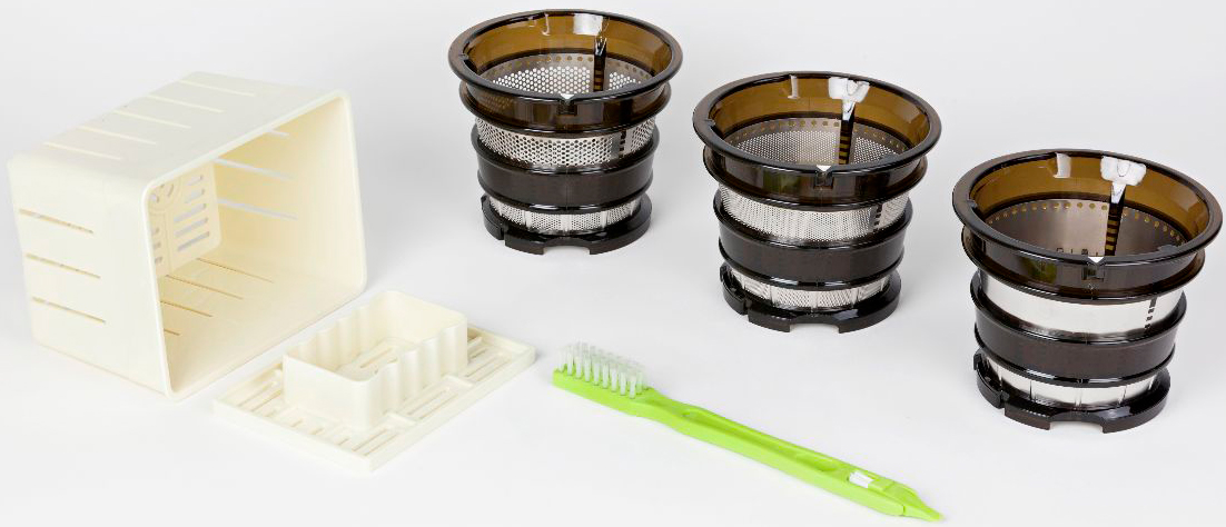 - два съемных контейнера из матового пластика (с ручками) – сбор жмыха (100х130х160 мм) и для сока (105х80 мм);