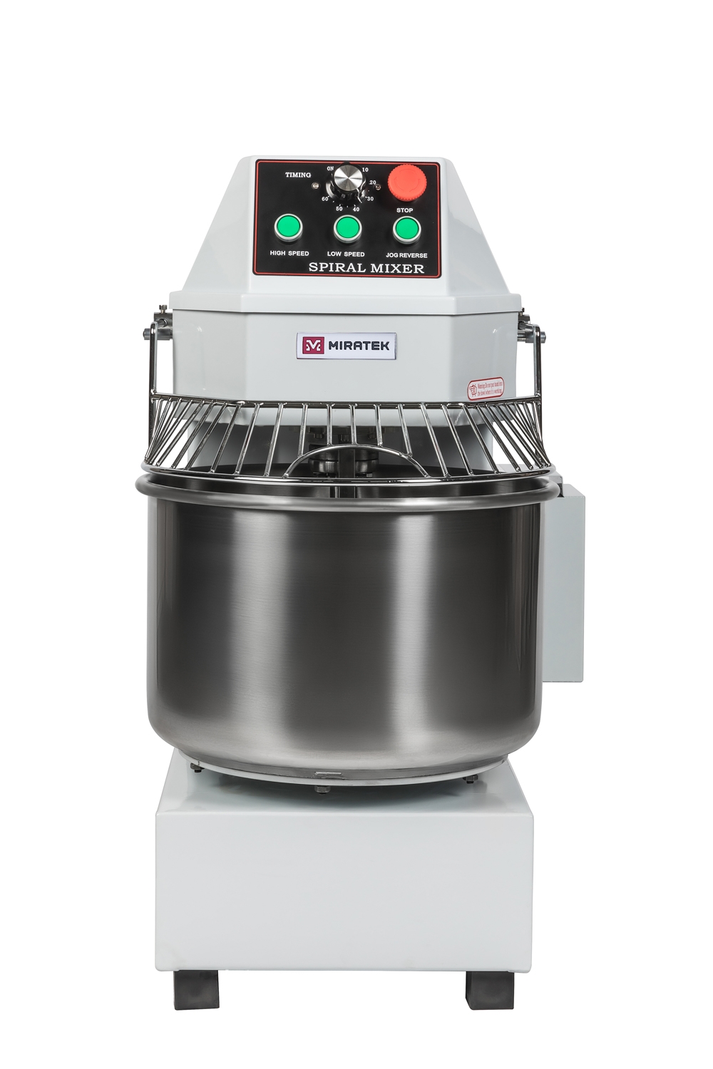 Тестомес спиральный Miratek PX-20 — двухскоростной напольный агрегат с фиксированной дежой и рабочей частью. Отличается универсальностью — подходит для замеса различных видов теста. Работает с минимальным шумом и без вибраций. Прочный корпус выполнен из крашеной стали, дежа из нержавеющего сплава, спираль и решётка из специального пищевого сплава. Предлагается с одно- и трёхфазным двигателем.В числе особенностей модели: