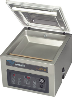 Аппарат Henkelman Boxer 35 используется для вакуумной упаковки пищевых продуктов на небольших производствах. Он рассчитан на 8 часовую рабочую смену, снабжен панелью управления с 10 изменяемыми программами, возможностью подключения функции газонаполнения (инертным газом), контролем времени замены масла. Система сварки пакета обеспечивает двойной сварочный шов, возможна замена одной сварочной струны на струну обрезки. Сварочные струны имеют полукруглую форму для надёжной запайки испачканных жиром пакетов.Характеристики