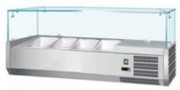 Витрина холодильная Enigma VRX1200/380 – для топпингов, с верхней защитной структурой из прямого стекла, имеет статическую систему охлаждения. Вместимость – 4хGN1/3-150 или 3хGN1/3+1хGN1/2-150 (гастроёмкости в комплект не входят). Температурный режим – +2...+8 ºC. Хладагент – R134a/R600. Внутренняя и внешняя поверхности выполнены из нержавеющей стали. Витрина имеет электронную панель управления с цифровым дисплеем, цифровым термостатом Dixell, компрессор Aspera и 4 регулируемые по высоте ножки. Энергопотребление – 1300 Вт/сутки.